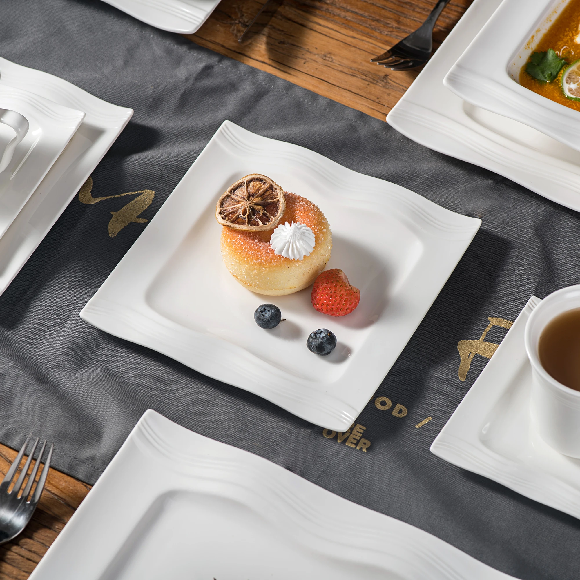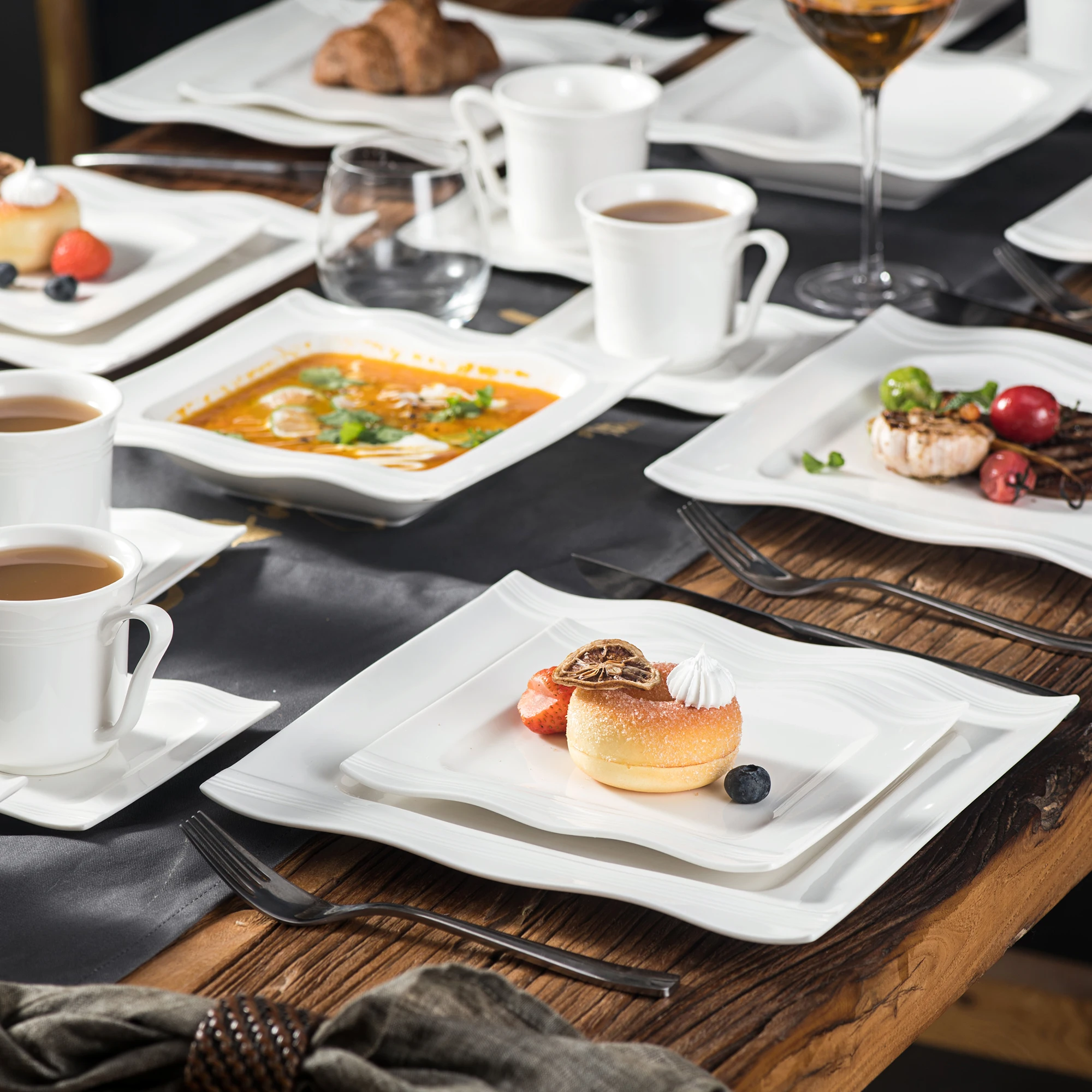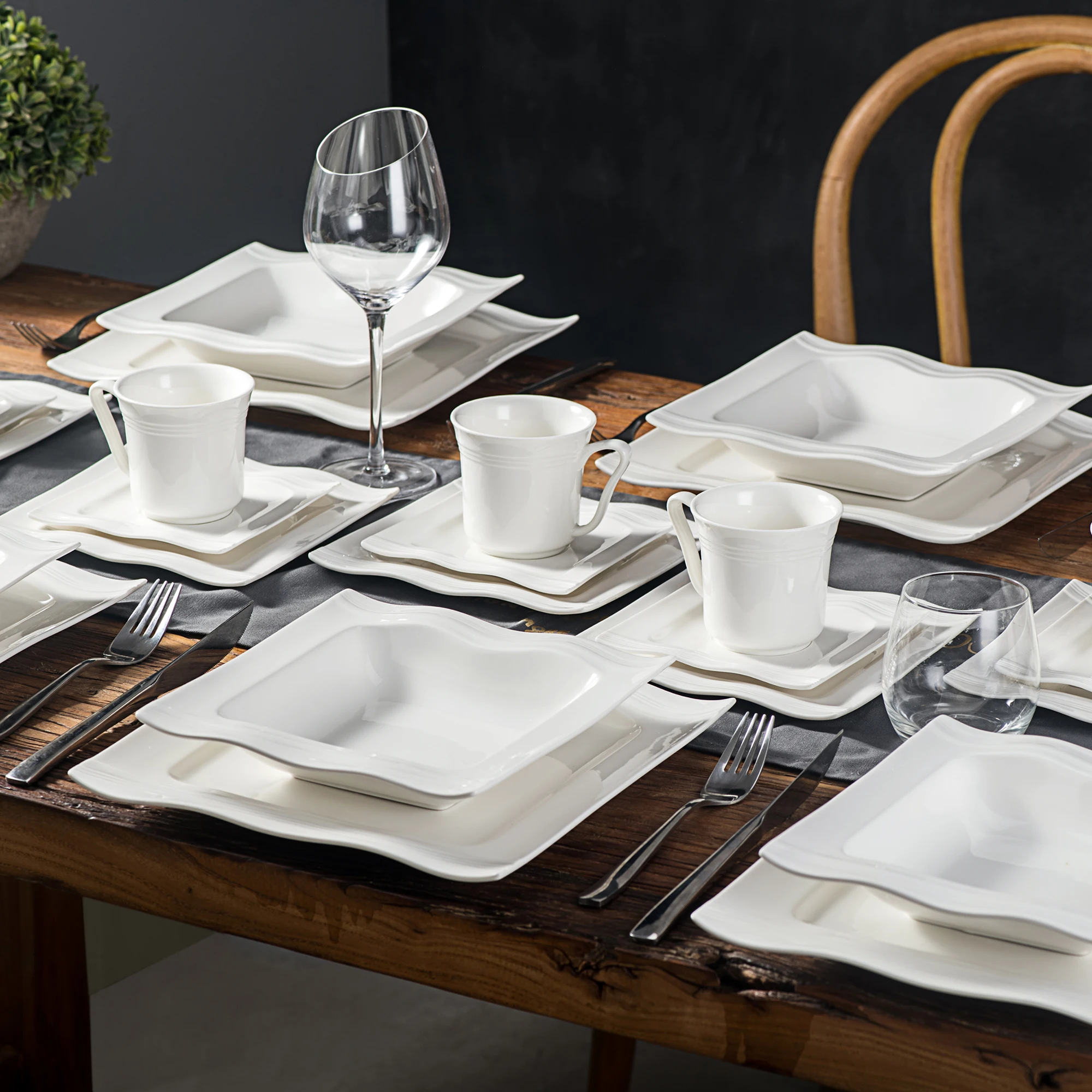 ● MALACASA dinner service sets are made of ivory white porcelain, FDA certified lead and cadmium free for everyday use. With classic square shape, making the dining table beautiful and elegant.