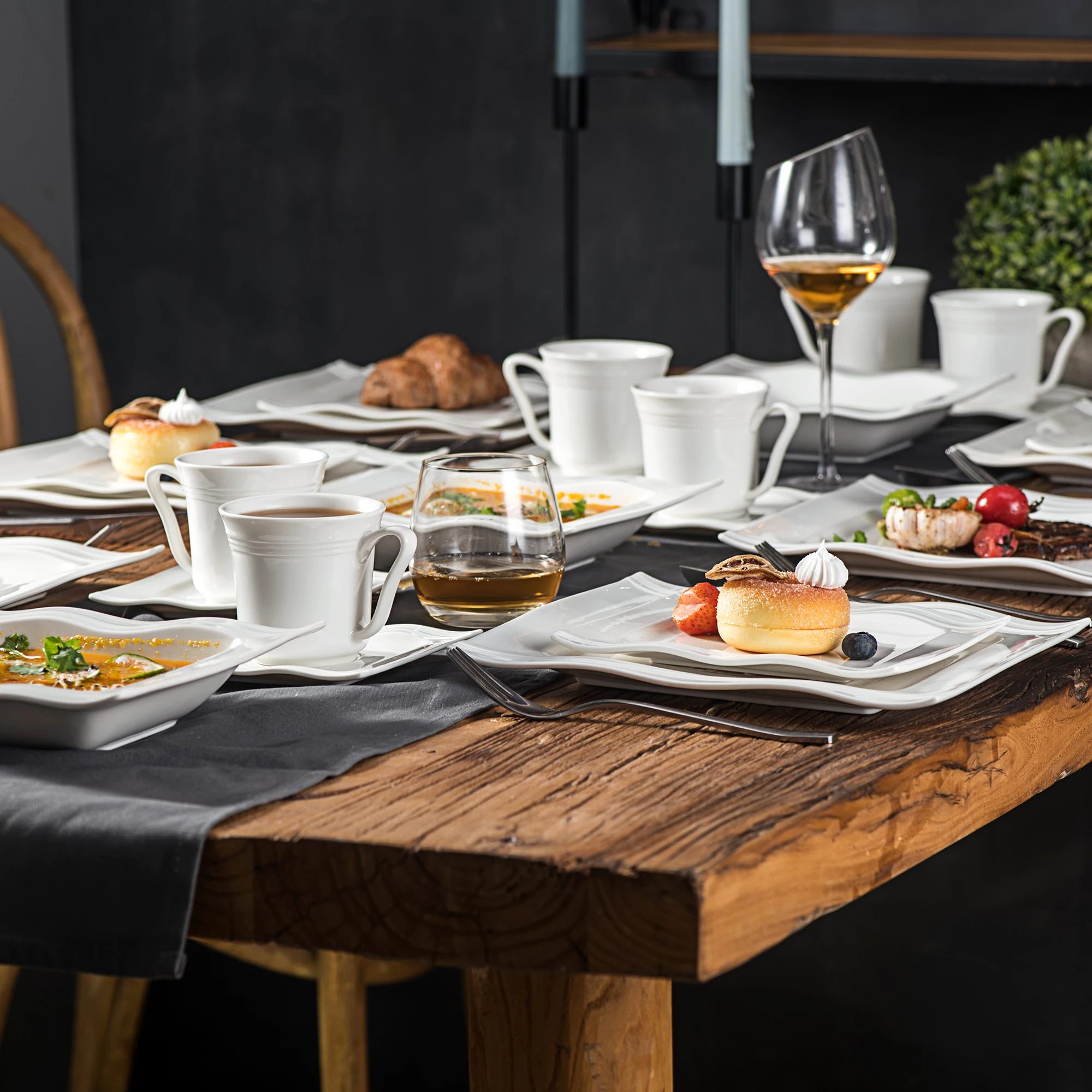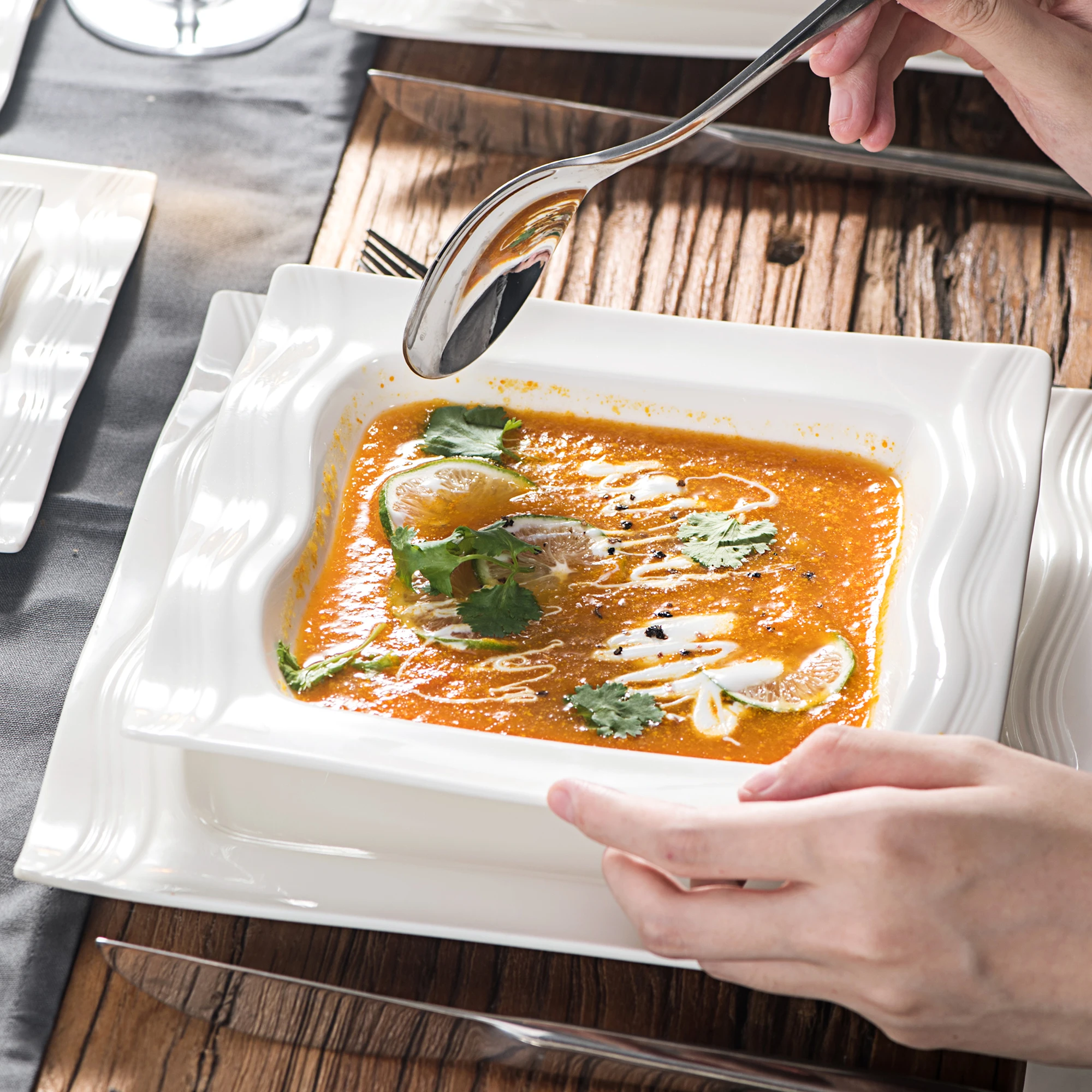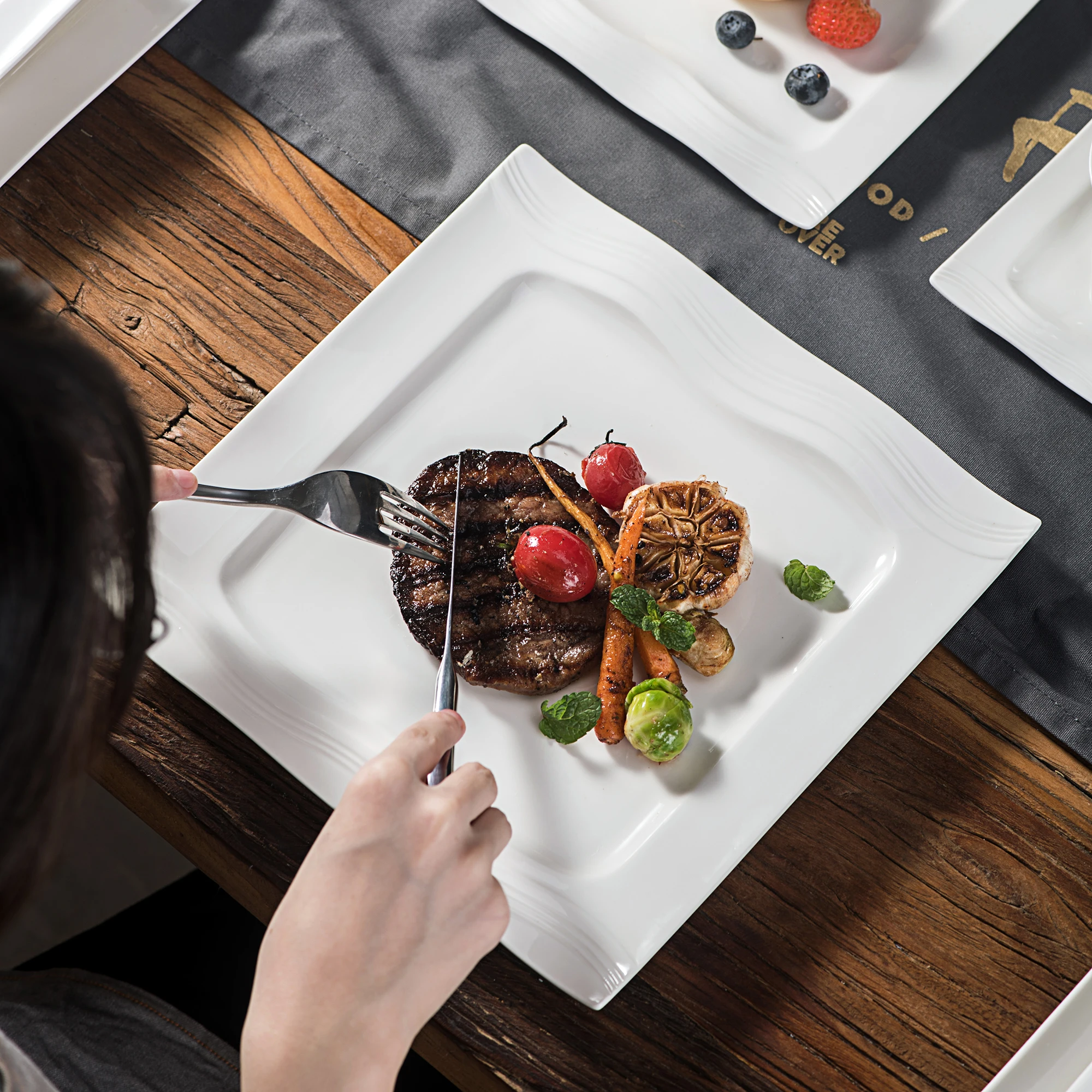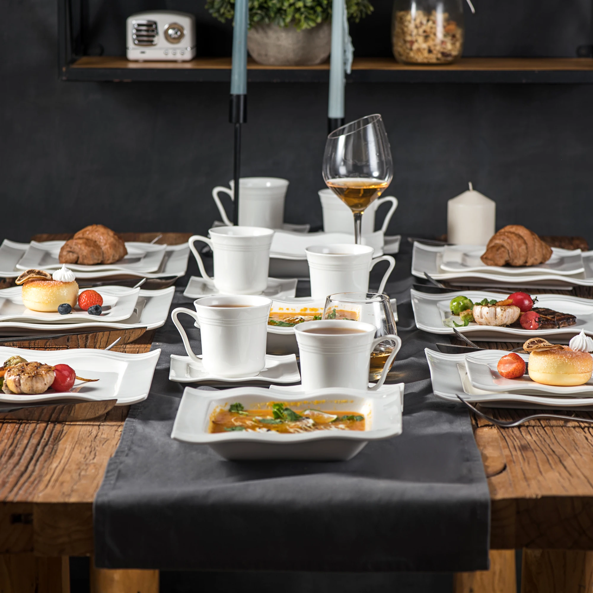 ● MALACASA dinner service sets are made of ivory white porcelain, FDA certified lead and cadmium free for everyday use. With classic square shape, making the dining table beautiful and elegant.